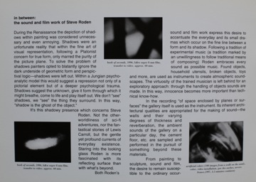considerably cranked-up. The music on the CD is titled ‘of space enclosed by planes or surfaces’ was composed entirely from very brief samples of sounds recorded in the Griffin gallery spaces. Whilst Mr Roden was there on a scout-about he recorded the sounds of construction that was occuring at the time and then went back into his studio to manipulate (or not), and treat these sounds as he saw fit. There is a conceptual blurb that accompanies his description of this process and his intent which compares making music to the craft of architecture. La-di-da. (As Woody Allen once made Diane Keaton say several and a half times sonewhere in that other architectural miracle, Manhattan.) The sonic construction itself is a slow, very minimal piece which drags itself into the listening space like a slow, slithering beast. Soft bass creeps in on padded feet, there’s the occasional rattle and bang; blurred voices spread like pools of oil. Just as soon as it starts it stops and I was left with the feeling of wanting more. (Dial Auto-Repeat, please) It’s perfectly concise, not only because of this technological possibility. At a low volume it could go on all day. Most certainly a space within a space. Brill !vital weekly 113