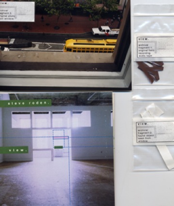 the idea of expanding the regular cd edition of ‘view’ began with my interest in harry bertoia’s monoprints. in researching his work of the 1940’s, i became intrigued by the immediacy and relative simplicity of his working process. here was a printing process that excluded the elaborate set-up, inking, etc. of etching or even the traditional monotype. it was immediate and simple – like running your hand along one of his sounding sculptures, and hearing music. it was a lot like drawing, yet yet the result was something else – an image on paper, resting between printed matter and hand made. it seemed to fit. as with the sound work, i again began with the windows of the gallery – this time using the window symbols as notated on a floor plan of the gallery, as images. i experimented with bertoia’s process of inking a piece of glass (wonderfully relevant to the notion of windows and view); placing a piece of paper face down upon the wet ink; and then, drawing with a sharp instrument (in this case a small metal nail). while one can see the feint rubs on the paper, the image remains invisible until one lifts the scarred blank surface to reveal the inked image transferred to its underside. unlike most printing process, each print must be completely re-drawn. there is no plate, and thus no multiples of the exact same image. the text is the first letter of every word in a section of goethe’s book on color theory. in the book, there are some great discussions of after images and reflections. the reference to both of these things felt relevant in terms of my own process of creating the soundwork ‘view’ from fragments of recordings through a window (both opened and closed). the final recordings are a kind of reflection, and fading after image, of the original view. images distorted through faulty lenses and fogged memories. the idea of including archive materials came from an interest in joseph cornell – my own humble attempt to create something emotionally relevant to his early small pillboxes containing colored beads, etc. – the notion of an archive edition is certainly a gesture for him. for duchamp as well – an archive in a box – an almost cubistic reading of reality broken up into every obtainable fragment of the original. the inclusion of things found within the visual field of the view, again relates not only to the notion of view, but to an interest in art as the result of an activity. an archive of experience. like richard long gathering stones from the side of a river; i travel to another city and collect my own ‘stones’. creating a life for those things that usually remain unnoticed. the archival fragments of audio tape, not only present the original inspiration and source material of the entire work; but expand upon my interest in how re-contextualization can lead one to consider things aesthetically. in this case, as its usefulness as an audio carrier is rendered mute; the tape fragment’s ability to become an aesthetic object grows. these are drawings of sorts. composed of lines. simply arranged by human hands. the project is not only an archive of bits – a tiny box of obsessive inclusion created for resonance within some other obsessive collector. the box is about how we perceive a view. how we determine its coordinates. how we process information – visual information, audio information, written information, evidential information, historical information, etc. it is about attempts at the creation of a whole from fragments – even before the whole is ever perceived. and in this case; until i arrived at the final moment when i photographed the view from the gallery window; it becomes about how one creates a record of a landscape or place, before one has ever even ‘seen’ it. – or further, how one can take the pieces of reality and reconfigure them to create reality anew.