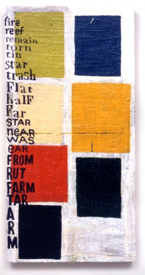 after working on my own for roughly 5 years out of grad school, my work began to evolve in both materials use and visual languages. much of my work was inspired by texts – and thus, letters were a large aspect of my visual language. i was interested in how the letters could form readable words, but also to be able to exist in a less decipherable situation – i.e. as visual elements of abstraction… at the same time i was looking at a lot of visual communication material – maps, diagrams, instruction sheets, and other bits of graphic design. in both cases, the use of words and diagrams offered me to a way of building images through known language, yet subverting the meanings of those languages – a sort of emptying them out, and then putting them back together in different ways so that their original intentions were subverted enough so that a reader/viewer would be able to create their own meaning, rather than simply deciphering a puzzle. these paintings had no set conclusion or end point, and while there were clear references to language, the paintings stubbornly would not resolve clearly. most importantly i wanted the paintings to feel open ended, so that a viewer could create meaning by engaging with the parts, allowing the viewer to create their own conclusions or end points.