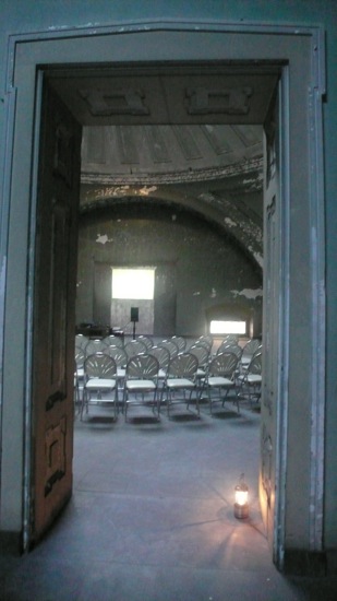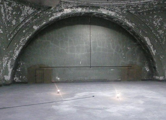 a year before the installation and exhibition i was invited to create work for the space for a single evening. this event, in 2008, was really a way of setting the table and/or starting to get a sense of how wound and intimate sound in particular would react to the space. thus, i showed a silent film, i did a sound performance, and i created two small sound installations.