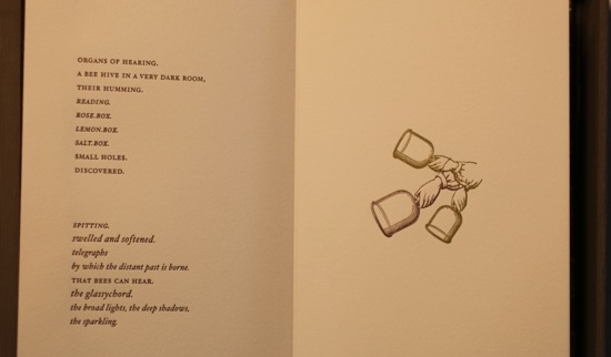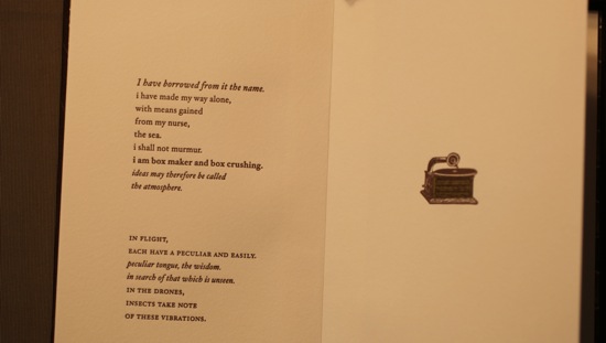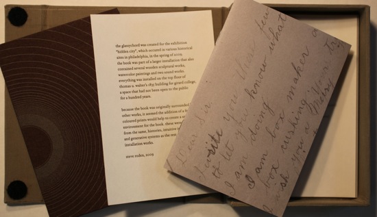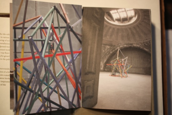 in 2009, for the actual exhibition, i created a large scale sound and sculptural installation, an installation of wooden sculpture, watercolor works and sound; and a letterpress book, presented on a victorian work table found in the space.