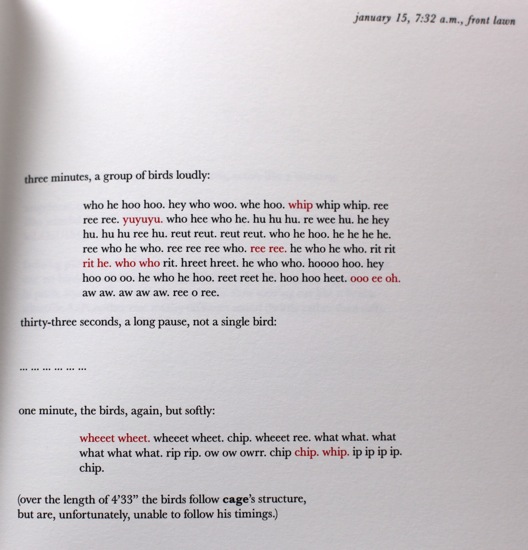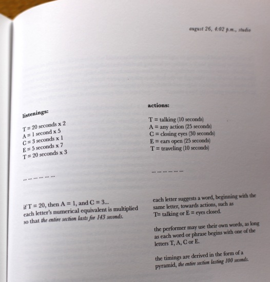 towards the end of 2010, i decided that i would perform cage’s 4’33” everyday for the year of 2011, generating both a disciplined listening experience every day, as well as writing – the eventually finished piece being a 400+ page text work entitled “365 X 433″. the idea was also to explore the score and its permutations, as well as how being confronted by it everyday might open it up.