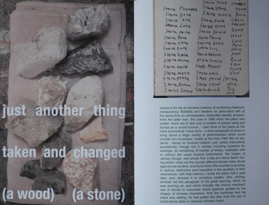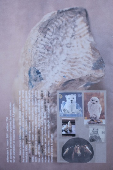 addendum 1 was a “zine” i created for the exhibition “stone’s throw” at susanne vielmetter LA projects. i have always been interested in publications, artist editions, such as the archigram publications, punk zines and fluxus publications – and as i have designed the bulk of my own cds and vinyl (as well as some catalogs), i was hoping that i could produce something to offer visitors as a kind of addendum to the work in the show. mostly, it is a collage of images from my grandmother’s reference file for her sculpture, other things i found in her studio, and numerous text fragments related to stones – such as a wall piece by lawrence weiner, a score by milan knizak, the score for christian wolff’s “stones”, and the chinese character as a medium of poetry by ernest fenollosa, etc. rather than spelling everything out, the idea was that the zine would be a small portable archive. i plan to continue self-publishing the zine in the future.