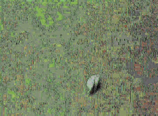 because the original film was a super low-res file; imovie’s contrast and color modulation tended to emphasize the fragmented make-up of the digital images, shifting large areas of white sky into bi-mapped persian rugs. rather than blending the digital artifacts into smoother imagery, i focused on the resulting psychedelic patterns, exploiting the software’s inability to deal with visual noise.