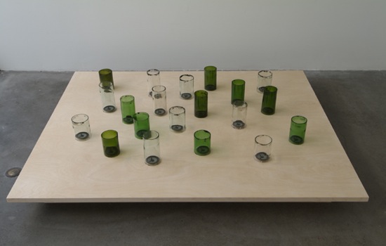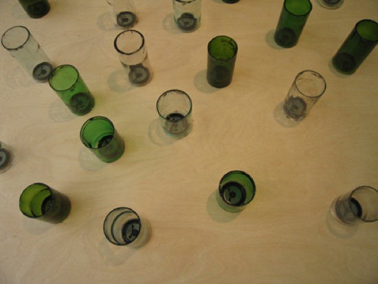 the glass bottles were hand cut and the bits of soot and ash are from the cutting process evoking a kind of alchemy and/or spirit. the delicate nature of the glass objects, cut roughly by my own hand is an attempt to offer an experience of intimacy and mediation on memory.