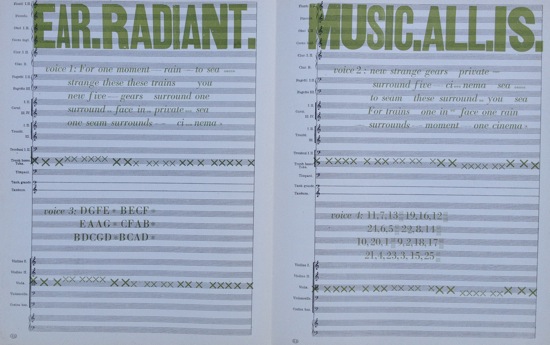 ear/radiant. music/all/is. is a re-working/translation of marcel duchamp’s erratum musical – a musical score/work which he created circa 1913. duchamp’s work for 3 voices includes a text and a musical score, giving each syllable of the original french text a musical note equivalent. the order of the notes came about through chance operation by drawing 25 different notes out of a hat.