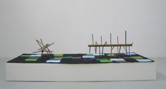 “finding words in notes” came out of the idea of the connection and separation of the notes on the lines and spaces of the musical staff. the small sculpture is a model of the notes on the spaces – f,a,c,e – while the larger sculpture is modeled by the notes on the lines – e,g,b,d,f. the colored stems are based on research in relation to synesthesia and various color-to-musical-note equivalents. the quilt uses a translation system informed by the combination of line and space notes for its structure. the sound composition also converses with this idea of the separation, yet connectedness, of the lines and spaces in that the speaker near the small sculpture plays a composition made from sounds of the space notes on a piano; while the speaker near the larger sculpture plays a composition made from the sounds of the line notes. these compositions are of different lengths, and interact with each other as a slowly shifting third composition made up of the two, as they improvise with each other. i was interested in the idea of combining parts that would, at times, feel comfortable and at others incompatible – of course i also had an interest in what would happen if there was a collision of sculptural objects, hand crafts, and sound…