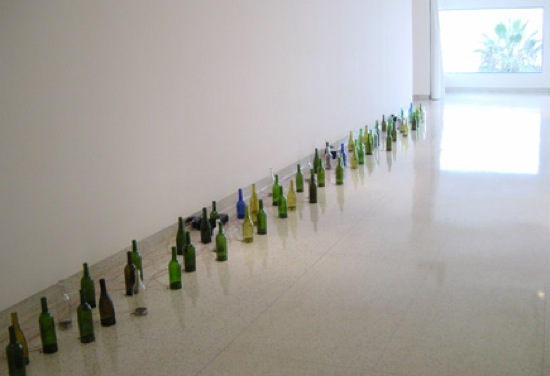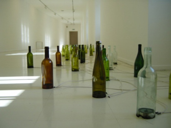 moon field consists of 100 glass bottles, each hand cut so that a small loudspeaker could sit beneath the glass – allowing the bottles to amplify the sound like a speaker cabinet.
