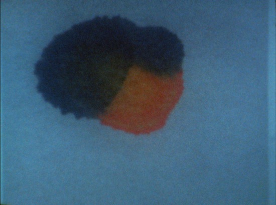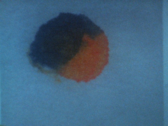 after the first 15 minutes or so, i suddenly felt the ink seeping through the bottom of the stack of paper and onto my pants, so i stopped the action, and waited for the film to end to see what had happened. to my surprise, i found myself holding a stuck together clump of toilet paper as if someone had blown their nose and a rainbow liquid has fallen out. when i arrived home, i carefully separated the wad of soaked paper into individual sheets and used my super 8 camera to animate sequence. luckily, even though the blob maintained a consistency in size, its interior mix of blacks and oranges were ever-changing – and the edges were constantly moving.