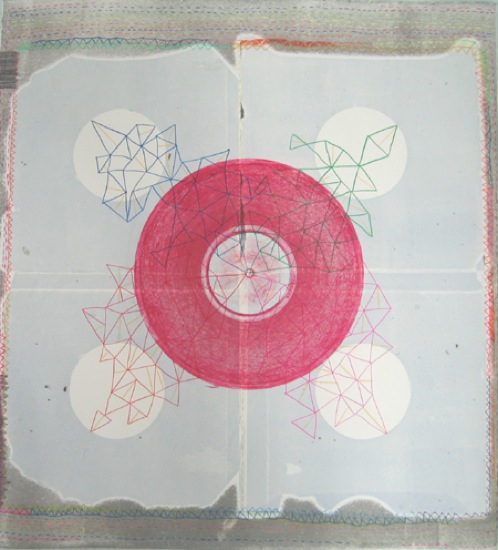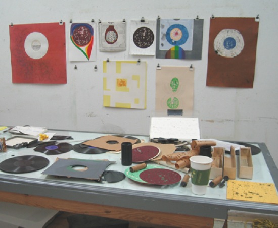 my half a plan involved the presence of two disconnected inspirations – one was the use of objects related to sound such as: using a player piano roll, mechanical instrument scores, old audio tape, old 78rpm records, record sleeves, paper speaker cones, wires, etc. were inked and run through the press… the other thing present in each work was the use of a series of 480 colored notations related to the parts list for one of buckminster fuller’s first pre-fab geodesic dome for the ford motor company (which listed 30 reds, and 90 yellows, oranges, greens, blues, and violets).