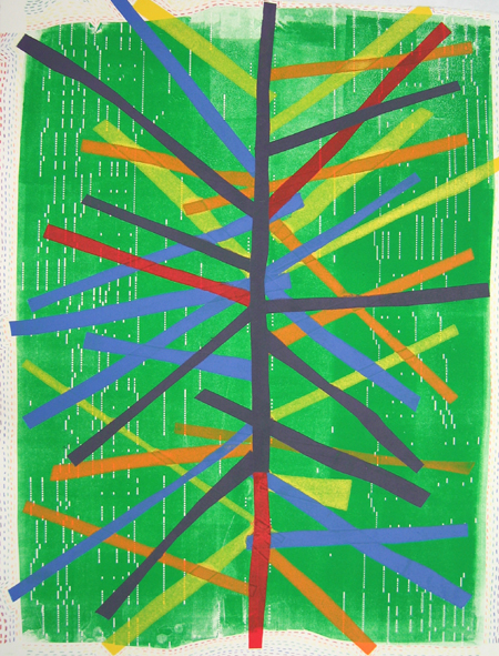every print i made had some relationship to sound and fullers 480 color coded parts. alongside these “things” was an attempt to allow the printing process itself to trigger decisions. i love old printed ephemera such as book covers, record albums, packaging, etc. so it made a lot of sense that i ended up responding to using mylar as a plate to generate flat blocks of color, shapes defined by cut edges of paper rather than a brush line or a pencil line. thus, the resulting flat colored shapes were particularly exciting because they could not have been made through the process of drawing or paintings – but could only come about through the printing process. the works were not planned out, but evolved organically, allowing the results of each run through the press to determine a next move.