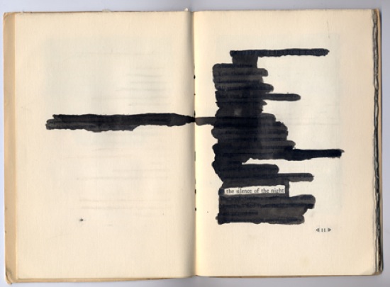 i then moved through the 46 page text, blocking out everything except the phrases and words that related to sounds and sound events. the idea was twofold – one to create a visual object through graphic manipulation, and second to emphasize all of the that the sounds towards a kind of score – where the words would suggest sound actions, while the black fields, spaces, and tendrils could suggest pauses or other paths… in the end finally finding a use for a book i couldn’t read.