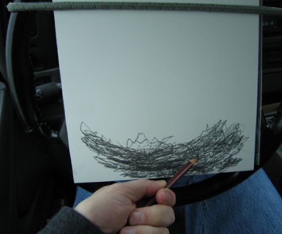the surface shifts drawings were created while driving in my car on the highway. i attached a board to my steering wheel with bungie cords, and was able to slip a piece of paper between the board and the cords so that it was held against the steering wheel. i held a pencil in my right hand and rested it between the paper and my body. i wanted to create a drawing through the combination of bumps in the road surface and turns of the steering wheel – a kind of graphic map of the movements of my vehicle along a particular area of road; and a different kind of topographical notation, or recording process.