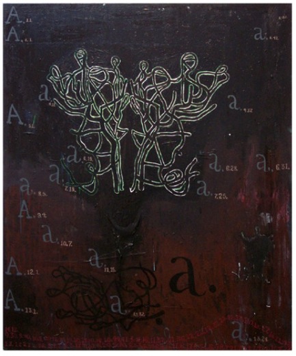 these paintings were an early attempt was to take didactic information and to open it up into a kind of fragmented and poetic voice. at the time i was beginning to use a lot of translation systems (not just vowels and colors, but trying to find ways so that the ‘information’ i was looking at might suggest determined paths, but also chance operation, as well as room for intuitive image building.