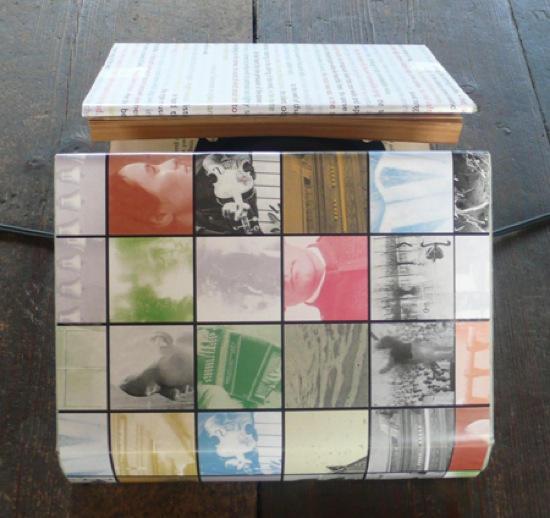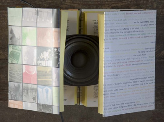 i began by notating every sound in the book, as well as every color in the book, as they appear in sequence. i used these two lists to generate a sound work, a text work, and a set of images. the sound installation consisted of of 15 sculptural forms, each made up of 5 elements – two old books, an audio speaker, and two artist printed “dust jackets” designed by the artist. the texts and images that are visible on the dust jacket follow the sound stream of the book, and both of these streams are color coded in relation to the colors that appear in the book. these objects, that contain the speaker, offer a kind of a relationship between what you are hearing and what you are seeing.