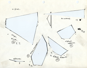 here are some of the beginnings of the installation: when stars become words, as well as some of the overall process. the work began with a 5 inch hand made “vowel ruler” – which i then used to create shapes. i tried to make a shape for every star name, but of course, some had only one or two vowels, and hence, i could not make a form with 1 or 2 lines… so for some of the shapes i combined the vowels of two different names. once i laid out the shapes, i cut them out of paper, and then used the templates to generate the same parts in thin cardboard. i then put the forms together intuitively, sort of like figuring out a complex jigsaw puzzle, as edges and angles needed to meet.