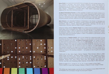 the publication was funded by a grant from the city of pasadena cultural affairs division and the pasadena arts commission thorugh its annual grant program. the recording of the installation was made by michael raphael.