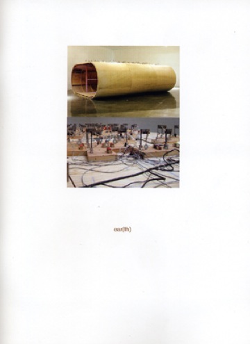 the cd contains a field recording of the installation ear(th), which was a collaboration with two scientists from cal tech. the installation consisted of an 8′ x 16′ x 24′ wooden structure with 80 robots on the roof that would strike glockenspiel bars based on data translating an image of an earthquake. it was comissioned by the williamson gallery at art center college of design.