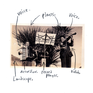 Vester Fields was composed using a found postcard to determine the following sounds/instruments used to generate the piece: violin (an old handmade tramp art instrument), accordion (a very small children’s toy accordion from china), voice (my own), plant (a shiso branch), field recordings (from marfa texas and a glacier in norway), and a 1940′s home recording (in the form of a 7 inch 78rpm cardboard record).