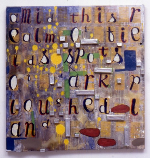 after working on my own for roughly 5 years out of grad school, my work began to evolve in both materials use and visual languages. much of my work was inspired by texts – and thus, letters were a large aspect of my visual language. i was interested in how the letters could form readable words, but also to be able to exist in a less decipherable situation – i.e. as visual elements of abstraction… at the same time i was looking at a lot of visual communication material – maps, diagrams, instruction sheets, and other bits of graphic design. in both cases, the use of words and diagrams offered me to a way of building images through known language, yet subverting the meanings of those languages – a sort of emptying them out, and then putting them back together in different ways so that their original intentions were subverted enough so that a reader/viewer would be able to create their own meaning, rather than simply deciphering a puzzle. these paintings had no set conclusion or end point, and while there were clear references to language, the paintings stubbornly would not resolve clearly. most importantly i wanted the paintings to feel open ended, so that a viewer could create meaning by engaging with the parts, allowing the viewer to create their own conclusions or end points.