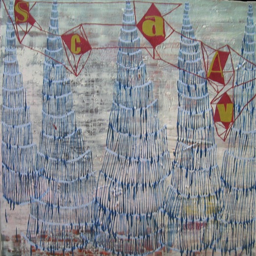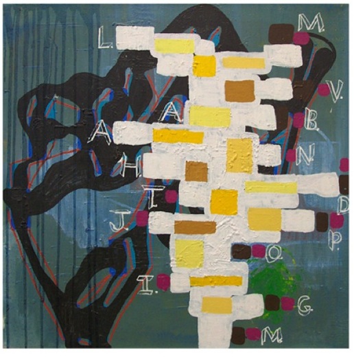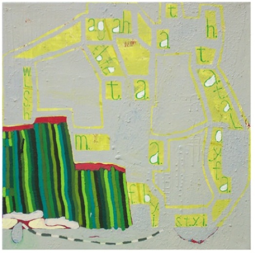 i began with a small group of paintings that would not have any visual reference to words or letters, using instead, a map as a visual template. i also began a long-term sculptural project related to a map of the moon, a set of drawings related to a text by hermann hesse, and a series of 26 sculptural objects related to the alphabet, my voice, and my beginnings of using a computer for my soundwork.