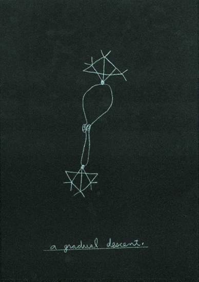 “the primary focus of my sound installations is the use of a singular non-traditional source for the creation of a sound/music composition within a given space. in many cases, the source is directly related to the place that the installation is presented in; such as the sounds of a gallery space or the sounds of an adjacent produce market. other times i have stumbled across audio inspiration in a more intuitive way, such as the use of the sounds of james joyce’s voice and drawings related to his placement of text on a page. in all of my work – painting, sculpture, video, and sound – i am interested in abstracting information of all types and re-presenting these things as a new and unfamiliar presence. my intention is to open things up, and to deny a single reading. the audio work is generally quiet, and non-narrative. it attempts to alter ones perception of the landscape, and to create a kind of audio architectural space that one can wander around in.”