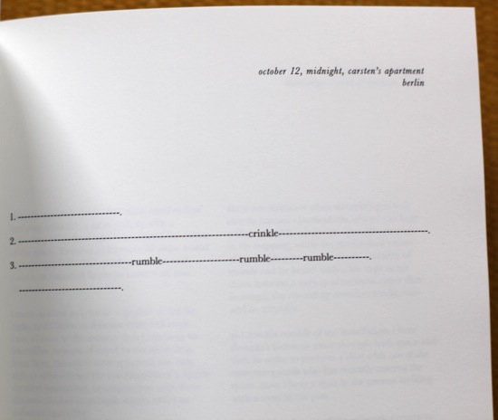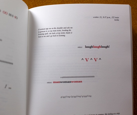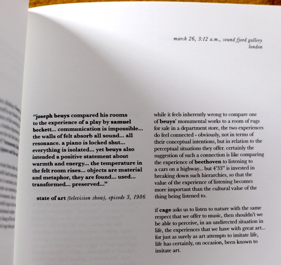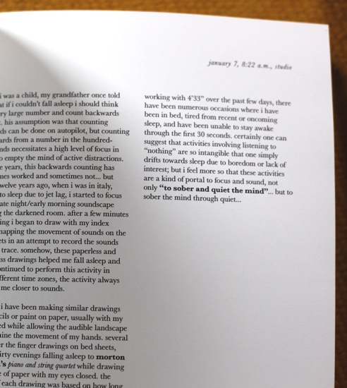 in early 2012, i showed some of the texts to toby kamps, who was curating a show at the menil collection, related to cage and silence, and our conversation veered towards the diary. i worked with addrienne wong on the design of the finished piece – the diary in 3 volumes, each covering four months of performances, the whole around 400 pages.