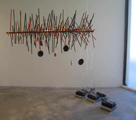 above the sand, flown and undone (levitation) is a collision of sorts – part sculpture and part sound piece – both birthed from connecting points of various similar inspirations: research on synesthesia and various color musical note equivalent lists, newspaper articles on gamelan music at the 1889 paris world’s fair, and a system for translating a few bars of classical music into building blocks for a sculpture.