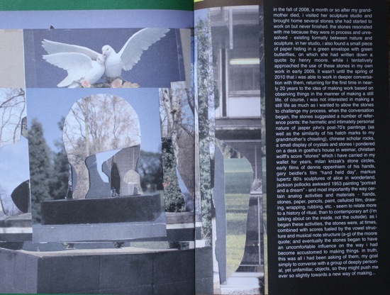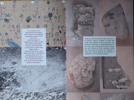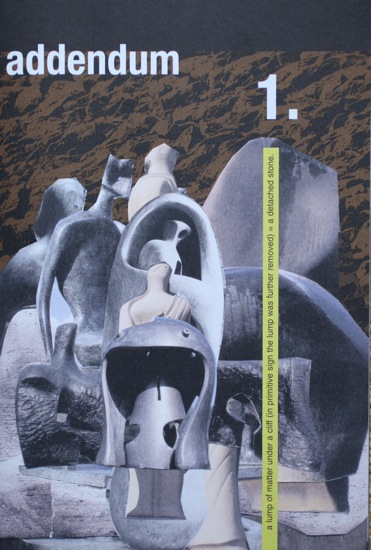 addendum 1 was a “zine” i created for the exhibition “stone’s throw” at susanne vielmetter LA projects. i have always been interested in publications, artist editions, such as the archigram publications, punk zines and fluxus publications – and as i have designed the bulk of my own cds and vinyl (as well as some catalogs), i was hoping that i could produce something to offer visitors as a kind of addendum to the work in the show. mostly, it is a collage of images from my grandmother’s reference file for her sculpture, other things i found in her studio, and numerous text fragments related to stones – such as a wall piece by lawrence weiner, a score by milan knizak, the score for christian wolff’s “stones”, and the chinese character as a medium of poetry by ernest fenollosa, etc. rather than spelling everything out, the idea was that the zine would be a small portable archive. i plan to continue self-publishing the zine in the future.