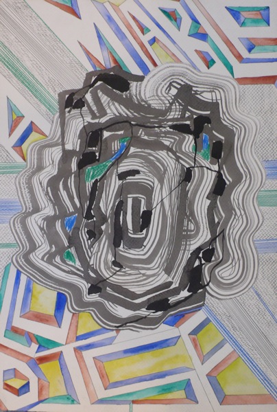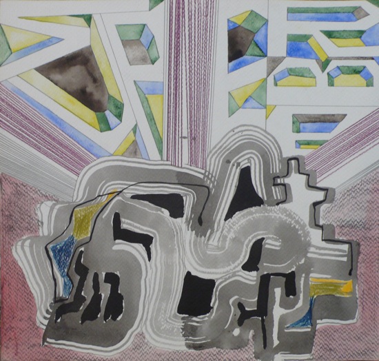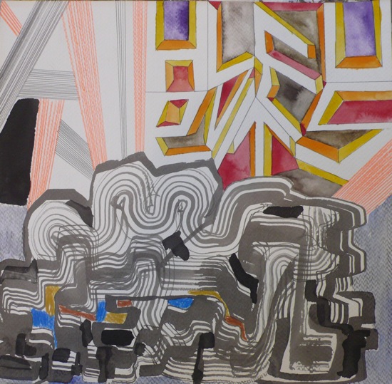 the drawings were generated from a list of names used to designate each of girard’s ships used in his mercantile business. the list reads like a beautiful piece of concrete poetry – deux amis, jeune bebe, voltaire, helvetius, julie, liberty… and so i decided to allow each name to generate a drawing that not only uses the name as a graphic element, but also as a score, determining intuitive mark making. for example, the name “julie” not only generated a kind of architectural form built of the word “julie” drawn in block letters, but contained a series of abstract marks, generated by using the word julie to determine the process of making abstract marks. with “julie”, because “j” is the 10th letter of the alphabet, my first mark with an ink soaked brush was a crooked line with 10 turns. for the second letter, “u” i made a line with 21 turns, then one with 12 turns for “L”, 8 for “i”, and 5 for “e”. in this way the word is not only visibly present, but has also determined my approach to the so-called abstract presences. along with the ink, there are pencil lines (both colored and traditional lead) that also follow the letter score “j-u-l-i-e”. you can see in the installation folder images of the drawings within the installation, which also contained sculptural forms and sound.
