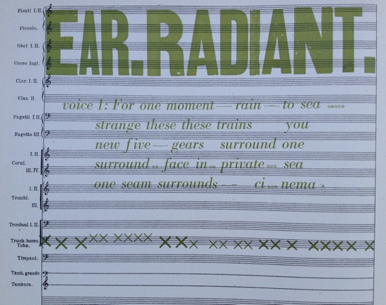 ear/radiant. music/all/is. is a re-working/translation of marcel duchamp’s erratum musical – a musical score/work which he created circa 1913. duchamp’s work for 3 voices includes a text and a musical score, giving each syllable of the original french text a musical note equivalent. the order of the notes came about through chance operation by drawing 25 different notes out of a hat.