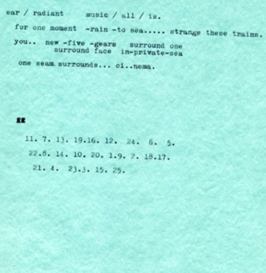 using duchamp’s original score, i intuitively translated the french into english – something i have done with many text projects using languages i do not understand. in this case, since i don’t speak much french or have a french dictionary… i used the duchamp’s french to generate an english equivalent based on the sound and structure of the french words and their potential towards english. in this way, “per une eme prein” became “for one moment rain”.