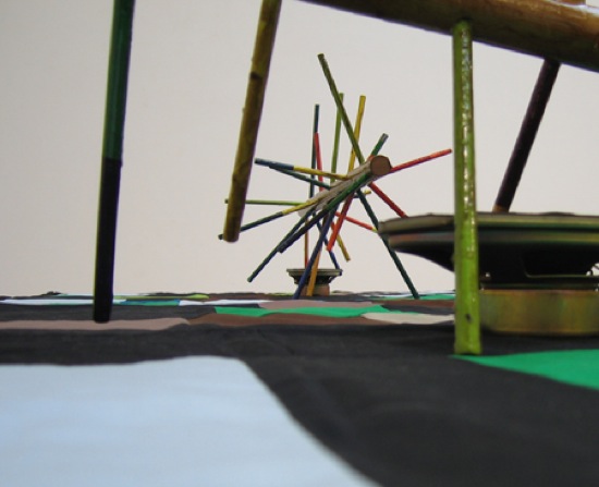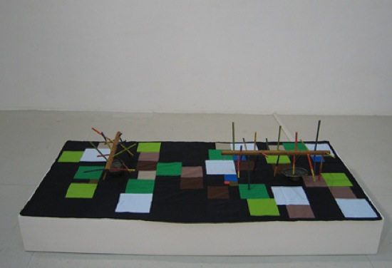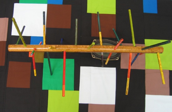 “finding words in notes” came out of the idea of the connection and separation of the notes on the lines and spaces of the musical staff. the small sculpture is a model of the notes on the spaces – f,a,c,e – while the larger sculpture is modeled by the notes on the lines – e,g,b,d,f. the colored stems are based on research in relation to synesthesia and various color-to-musical-note equivalents. the quilt uses a translation system informed by the combination of line and space notes for its structure. the sound composition also converses with this idea of the separation, yet connectedness, of the lines and spaces in that the speaker near the small sculpture plays a composition made from sounds of the space notes on a piano; while the speaker near the larger sculpture plays a composition made from the sounds of the line notes. these compositions are of different lengths, and interact with each other as a slowly shifting third composition made up of the two, as they improvise with each other. i was interested in the idea of combining parts that would, at times, feel comfortable and at others incompatible – of course i also had an interest in what would happen if there was a collision of sculptural objects, hand crafts, and sound…