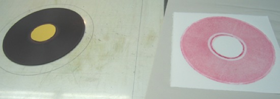 my half a plan involved the presence of two disconnected inspirations – one was the use of objects related to sound such as: using a player piano roll, mechanical instrument scores, old audio tape, old 78rpm records, record sleeves, paper speaker cones, wires, etc. were inked and run through the press… the other thing present in each work was the use of a series of 480 colored notations related to the parts list for one of buckminster fuller’s first pre-fab geodesic dome for the ford motor company (which listed 30 reds, and 90 yellows, oranges, greens, blues, and violets).