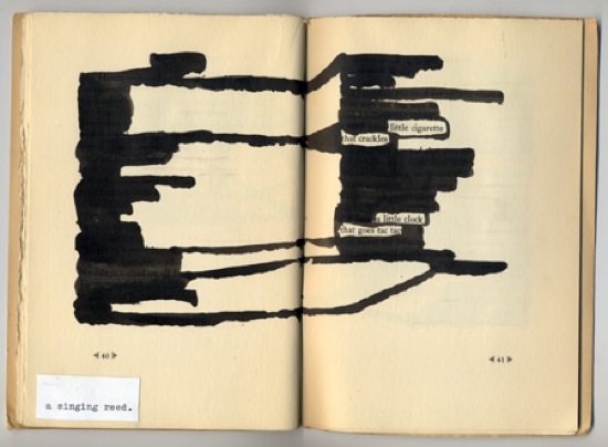 i then moved through the 46 page text, blocking out everything except the phrases and words that related to sounds and sound events. the idea was twofold – one to create a visual object through graphic manipulation, and second to emphasize all of the that the sounds towards a kind of score – where the words would suggest sound actions, while the black fields, spaces, and tendrils could suggest pauses or other paths… in the end finally finding a use for a book i couldn’t read.