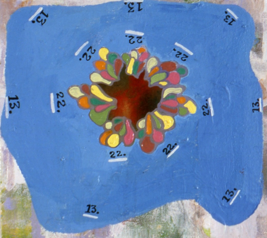 these paintings were an early attempt was to take didactic information and to open it up into a kind of fragmented and poetic voice. at the time i was beginning to use a lot of translation systems (not just vowels and colors, but trying to find ways so that the ‘information’ i was looking at might suggest determined paths, but also chance operation, as well as room for intuitive image building.
