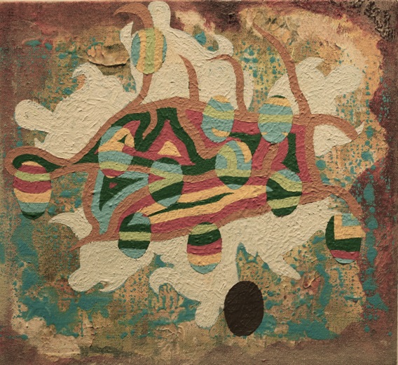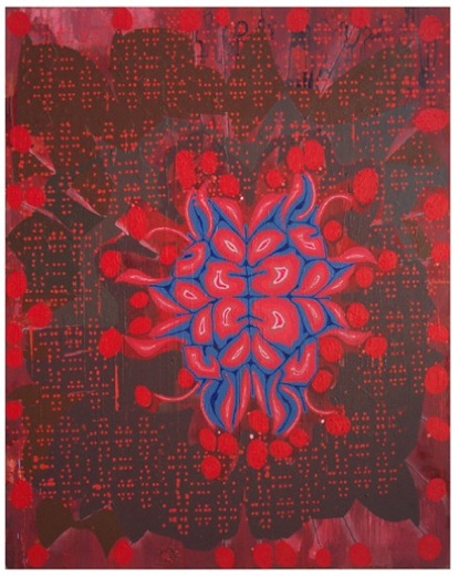 the small paintings began with the discovery of a 1950’s plastic model kit for children, that explained how the sense of touch worked (and hence, the title for the small works was, ‘the anatomy of touch’).  in the paintings, i used various parts of the kit (magnified parts of a fingertip) as well as the instruction sheet, as building blocks for abstract images.