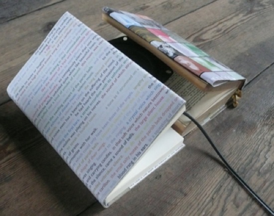 i began by notating every sound in the book, as well as every color in the book, as they appear in sequence. i used these two lists to generate a sound work, a text work, and a set of images. the sound installation consisted of of 15 sculptural forms, each made up of 5 elements – two old books, an audio speaker, and two artist printed “dust jackets” designed by the artist. the texts and images that are visible on the dust jacket follow the sound stream of the book, and both of these streams are color coded in relation to the colors that appear in the book. these objects, that contain the speaker, offer a kind of a relationship between what you are hearing and what you are seeing.